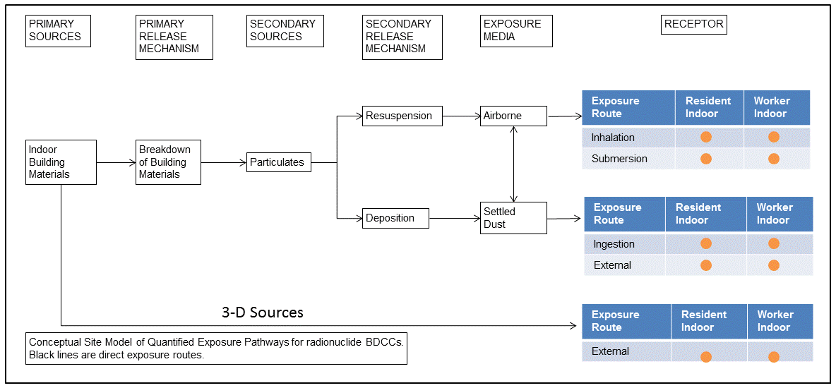 The BDCCs are generated with standard exposure route equations using EPA DCFs and parameters. Exposures to other media can be addressed by other calculators. For exposure to contaminated materials outside a building, use the SDCC (Dose Compliance Concentrations for Radionuclides on Outdoor Surfaces at Superfund Sites), respectively. A DCC calculator receptor represents the reasonably maximum exposed (RME) individual, as does a BDCC receptor. Since the DCC RME is often outside and the BDCC RME is always indoors, an individual receiving both indoor and outdoor exposures at a site should be protected when both tools are used.
