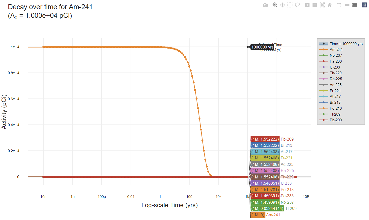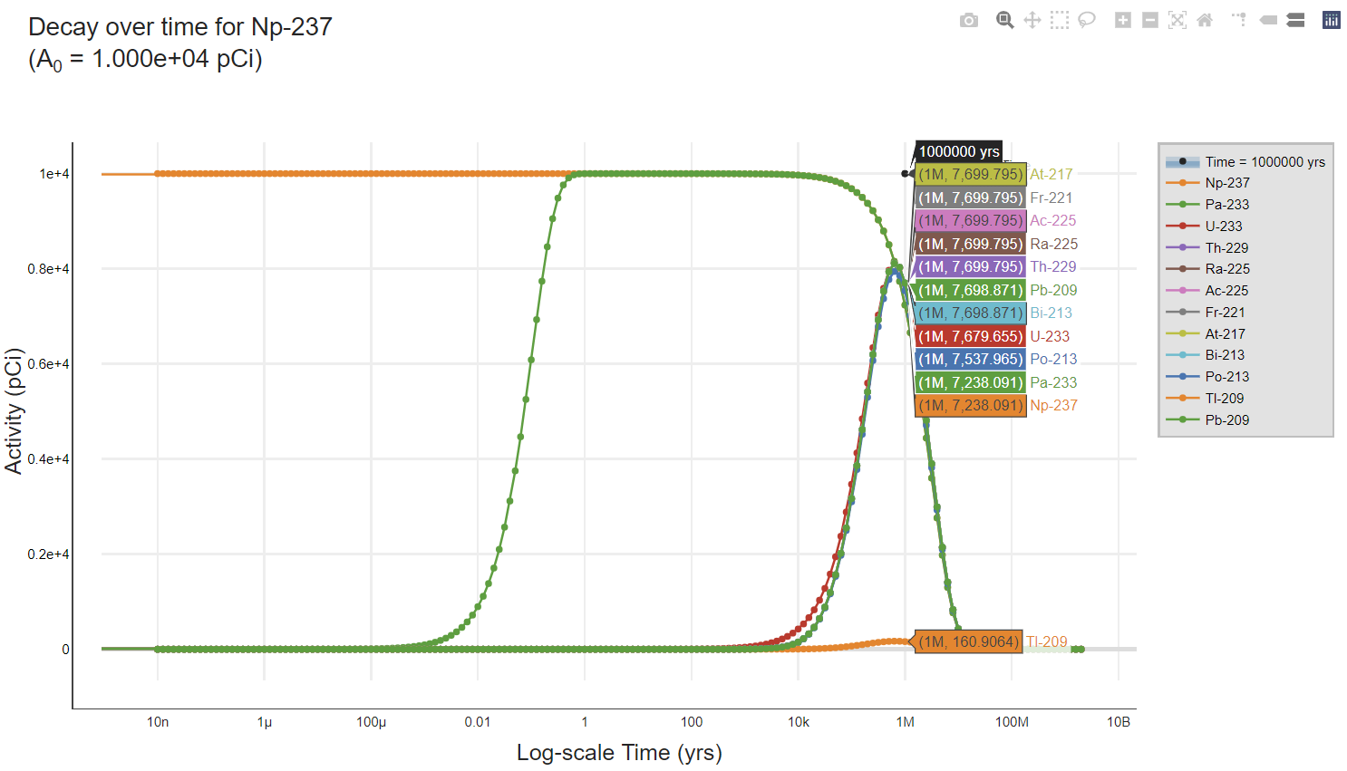 The above figure shows a decay curve for Am-241 over one million years with an initial activity of 10,000 pCi. The progeny levels are near zero because the first progeny is long-lived relative to the parent. The figure below is for Np-237, the first progeny of Am-241, which has a half-life approximately four orders of magnitude longer than its parent. In the figure below, the initial activity was also 10,000 pCi. At 1 million years, the progeny activity is approximately four orders of magnitude higher than the Am-241 decay curve. This analysis demonstrates the reason the Peak BDCC is similar to the parent only BDCC for these transuranics with short half-lives relative to their progeny.