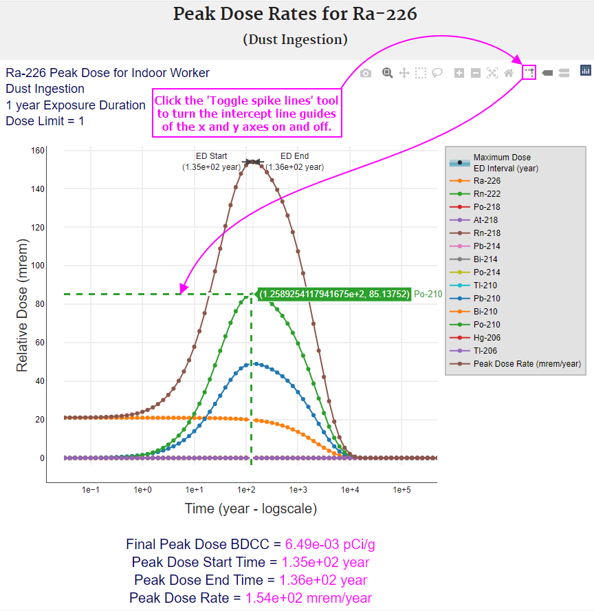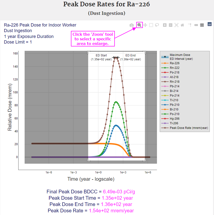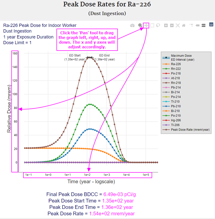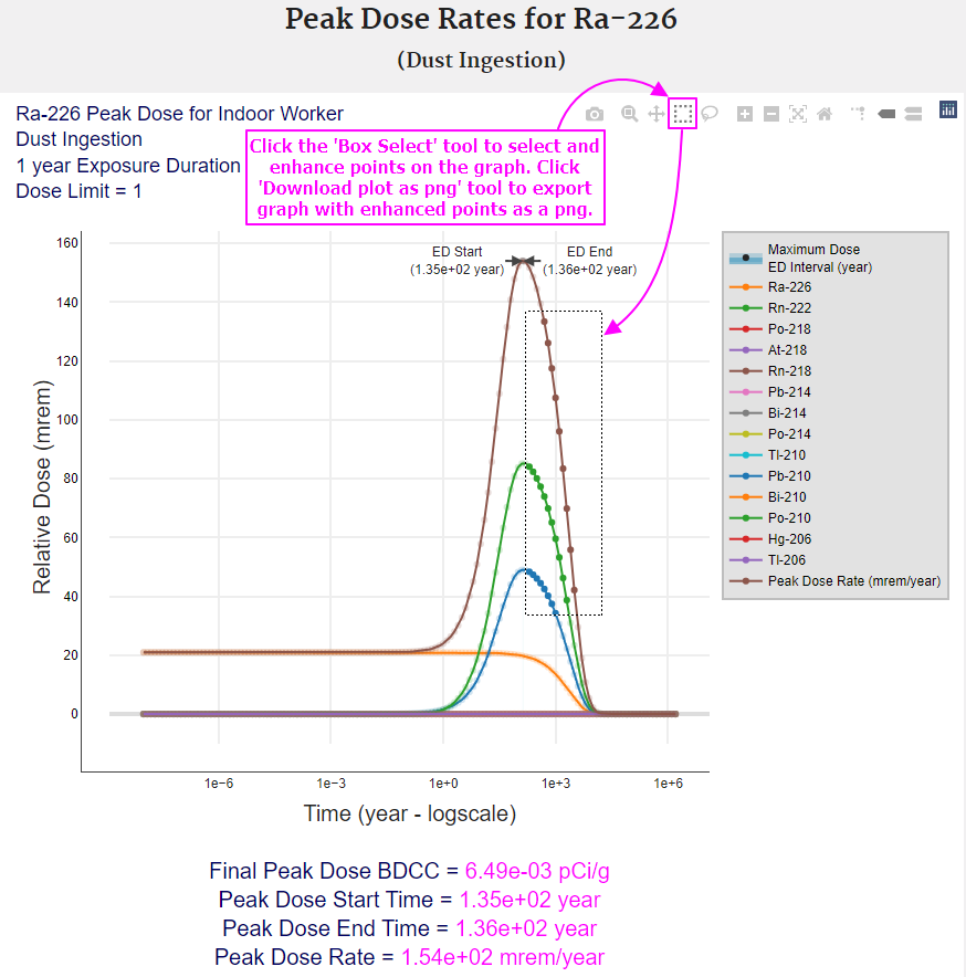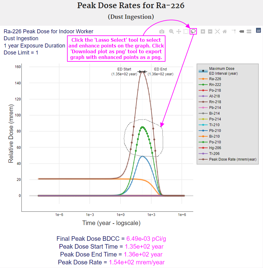 The following images provide instructions for exploring and understanding the peak dose graphs.