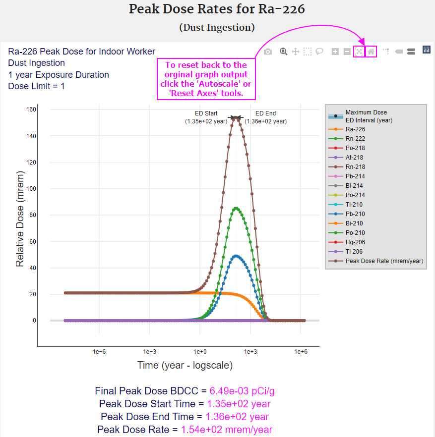 The user may also select a defined time period to search for the period of peak dose. This option operates just like the infinite time option but stops searching for the period of peak dose at a user-defined time in the future. Predefined time points of 10,000, 1,000, and 100 years are offered as well as the option for the user to enter a specific time period between 70 and one trillion years. These options are only offered for use in certain situations where a regulatory agency is concerned with dose at certain time points in the future. If a peak hasn't been resolved in the entered time period, as is the case when progeny are still ingrowing, the dose interval will be calculated for the last exposure duration span. For instance, if the time period of 100 years is selected for default resident dust for U-238 (ED of 1 year), year 100 will be selected by default, because U-238 peak dose isn't until year 3,981,072.